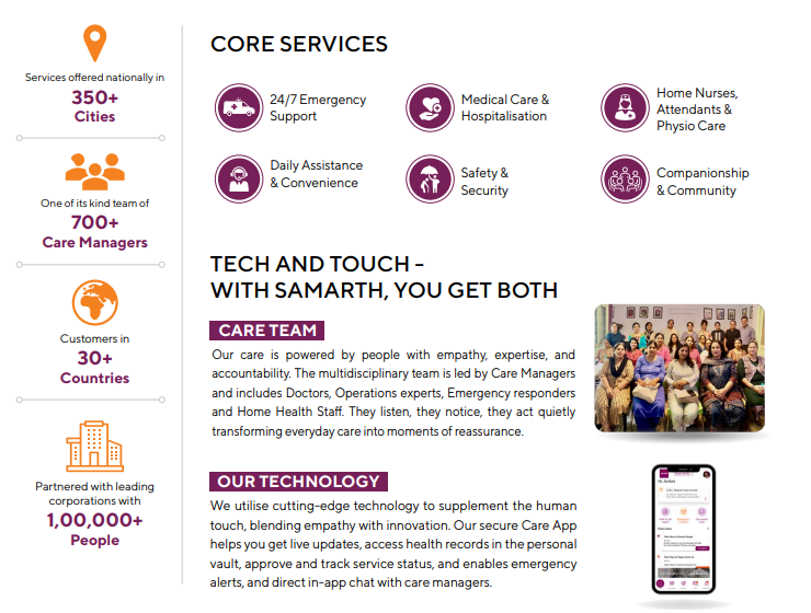 Samarth is India’s leading eldercare organization, dedicated to empowering senior citizens to live independently with dignity, safety, and joy. With a presence in over 350 cities and a clientele spanning 33+ countries, Samarth offers a comprehensive ecosystem of services—from health coordination and emergency support to companionship and community engagement.